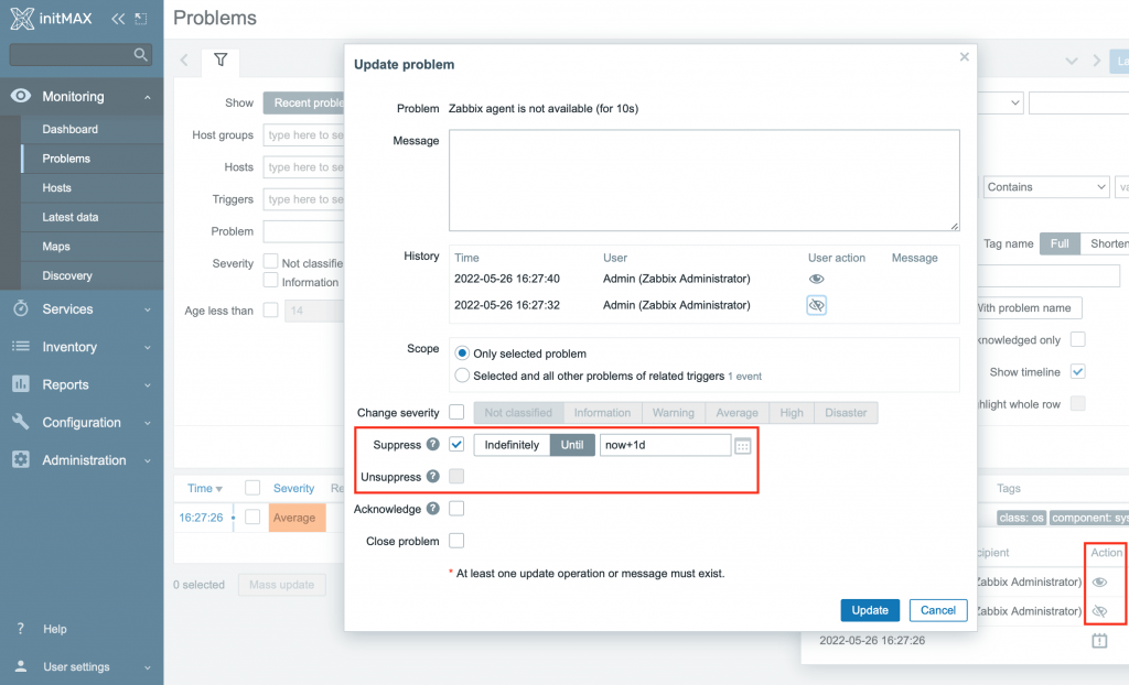 Toto nové tlačítko, které najdete v sekci „Monitoring > Problémy“, umožní ignorovat vámi vybraný konkrétní problém v seznamu problémů. Můžete si také zvolit, na jak dlouho chcete problém schovat – buď na základě limitace času, nebo až do manuálního odvolání.