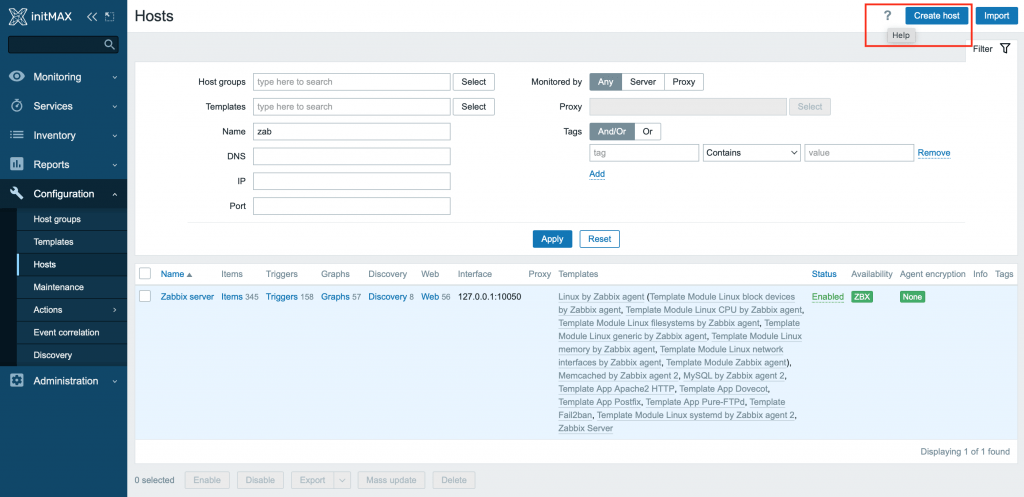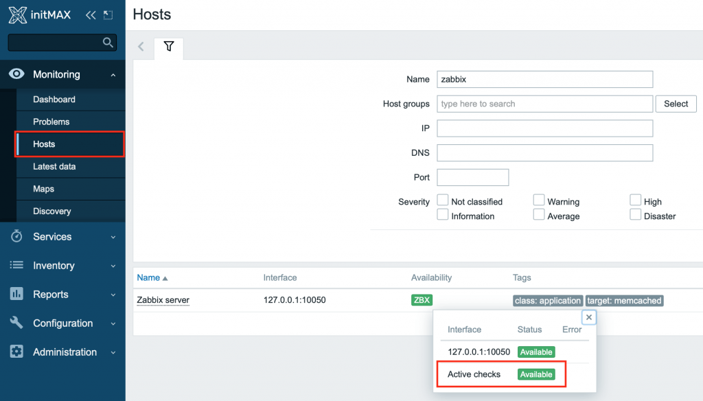 Aktivní položky Zabbix agenta nyní také ovlivňují dostupnost hostitele, jak je vidět v části Monitorování > Hostitelé nebo Konfigurace > Hosté