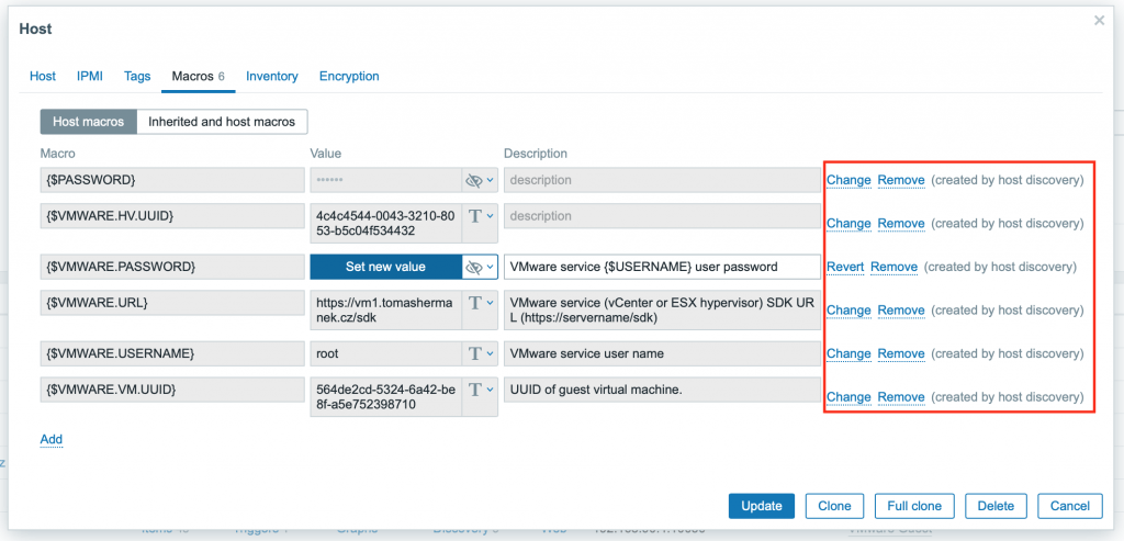 Makra lze nyní ručně měnit na hostech vytvořenými přes LLD (low-level discovery). Dříve mohly hosté z LLD používat pouze makra definovaná v konfiguraci prototypu hostitele a Šablon. Nyní lze makra měnit a definovat dle potřeby, přímo na úrovni hosta.