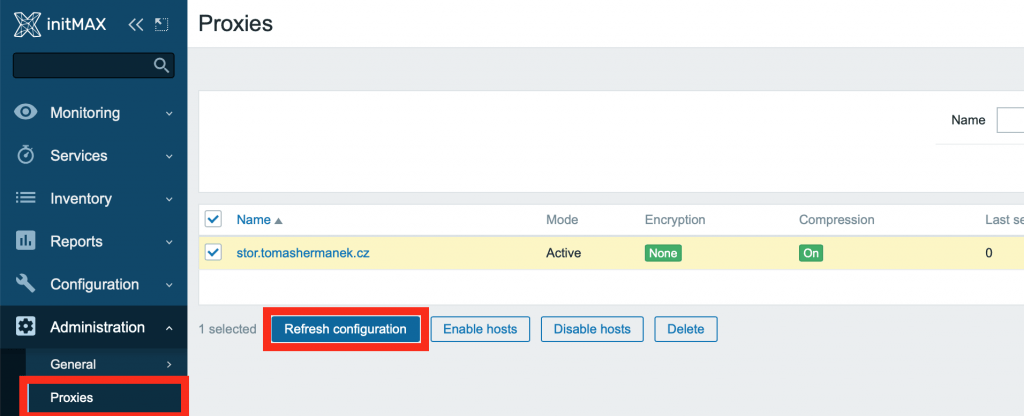 - pomocí příkazu řízení běhu serveru Zabbix (např. zabbix_server -R proxy_config_cache_reload) z frontendu (v seznamu proxy nebo editačním formuláři proxy)
